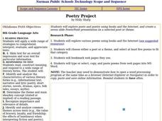 Choosing a poet or a theme, eighth graders conduct research in the world of poetry. They conduct Internet research and select five poems that fit their poet or theme, and create a seven slide PowerPoint presentation on their selected...