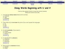In this slang learning exercise, students complete an 8 question multiple choice on-line interactive exercise about the meaning of slang expressions beginning with letters U or V.