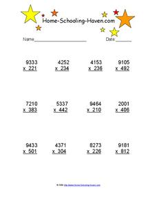 In this multiplication practice worksheet, students practice their math skills as they solve 36 problems that require them to multiply 4 digit numbers by 3 digit numbers.