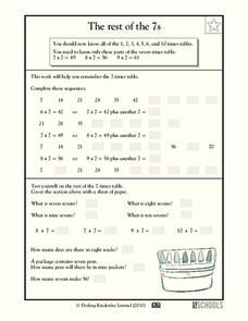 Help your fourth graders master the 7 times table. They complete number sequences and solve multiplication problems in numerical and written formats. Once they finish this activity, they'll be ready to take on 8s and 9s!