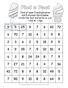 Have young mathematicians find multiplication and division facts in an 8x8 summer-themed grid. Class members identify three sets of numbers that include a quotient and product by inserting the appropriate signs between each...