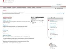 Learn the ins and outs of matrix multiplication. After discovering the commutative property does not apply to matrix multiplication in a previous lesson in the series, pupils now test the associative and distributive properties. The...