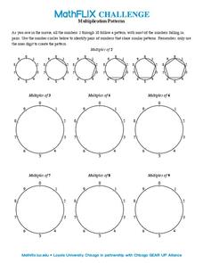 In this multiplication patterns worksheet, students solve and complete 6 different problems that include using patterns to multiply. First, they use the numbers circles on the sheet to identify pairs of numbers that share similar...