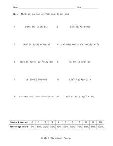 For this rational fractions worksheet, 9th graders solve 10 different problems that contain using multiplication to solve them. First, they multiply the numerators, then they multiply the denominators in each problem shown. Students also...