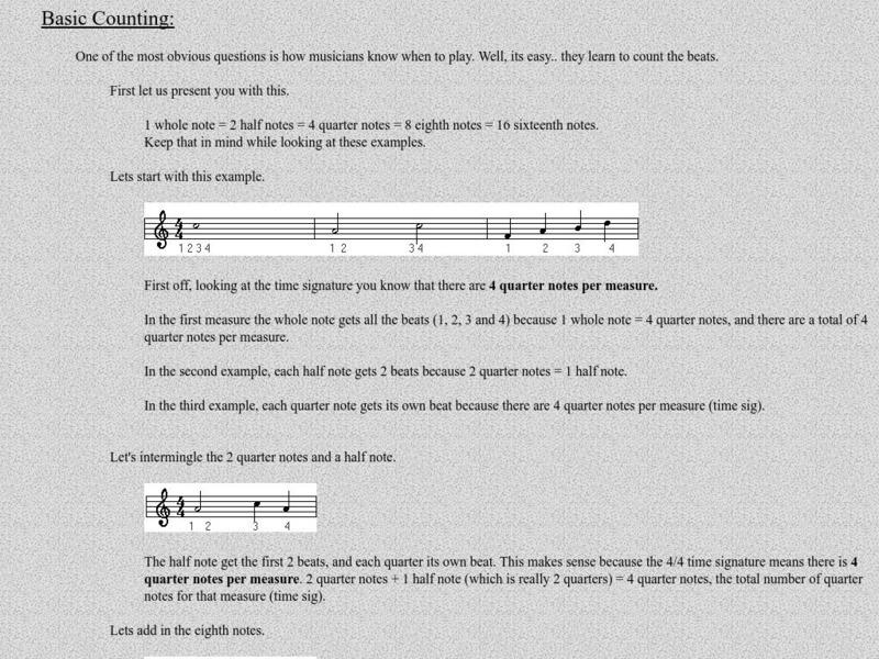 Beginning musicians can practice reading notes and counting beats using this resource that also provides several lines of music with different types of notes, rests, and time signatures.