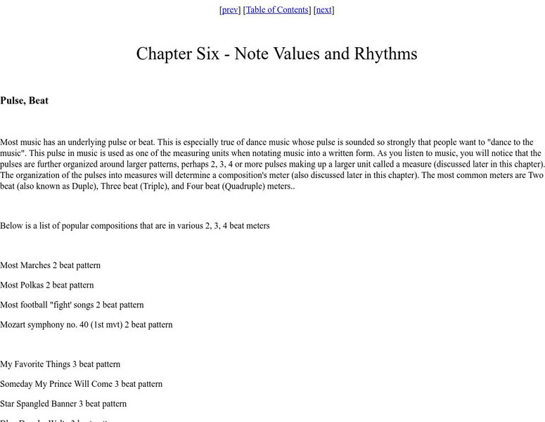 This site looks at rhythm, terms and concepts, which include rhythm, score, note (parts of and kinds), rests, tie. Great information.