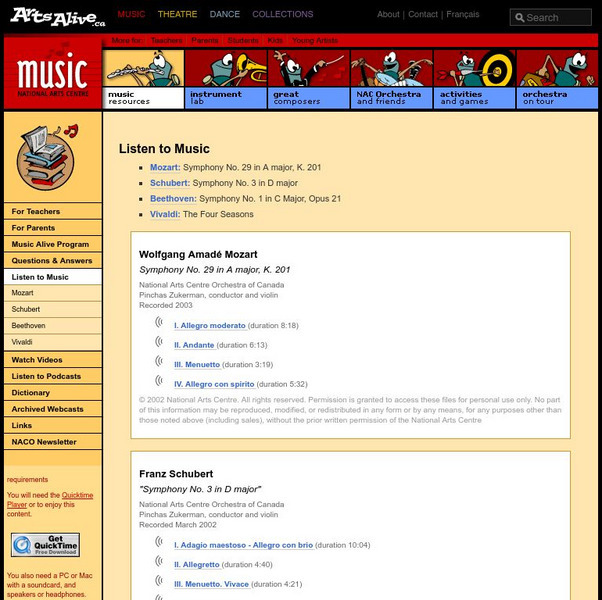 Listen to the music of Mozart, Schubert, Beethoven, and Vivaldi. Link from this page to related information, such as biographies of these composers, commentary on their works, and educational activities that test your knowledge and...
