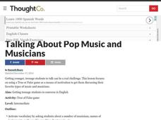 Students focus on using a True or False game as a means of motivation to discuss their favorite types of music and musicians.