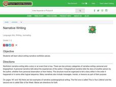 Writing is a process, and lesson planning is, too! A personal narrative unit stresses the writing process to pupils, who first examine various stories and poems as a model of autobiographical writing and then write their own stories....