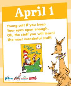 Celebrate National Poetry month with a quote a day from Dr. Seuss's books. Each poster includes the date (a day in April), a quote from a book, an image from the book, and a thumbnail of the book cover.