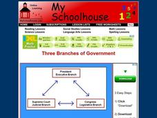 In this United States government worksheet, 5th graders examine a diagram of, and read about the three branches of government. They read about the Supreme Court, Congress, and the President before answering 10 online fill in the blank...