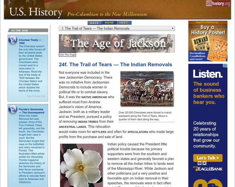The Cherokee were not the only Native Americans affected by the Indian Removal Policy. Read about the Sac and Fox Indians in Illinois, and the Seminole in Florida. In addition, read about the many attempts, including a law suit filed by...