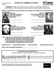 In this music worksheet, students answer questions about composers George Gershwin, Aaron Copland, John Philip Sousa, and Leonard Bernstein. Students also reflect on why they are called the Giants of American Music.