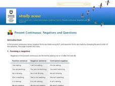 In this grammar practice worksheet, students match questions with their answers, create questions, make positive sentences negative, and put sentences in the present continuous tense. There are twenty nine fill in the blank and short...