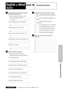 In this English grammar worksheet, students write answers from given questions, put words in order to create a sentence, complete questions with do or does, and make sentences negative. Students answer thirty one fill in the blank and...