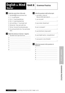 In this grammar worksheet, students practice using has/has got, change positive sentences into the negative form, write questions, and identify the correct form of the verb in a sentence. Students answer thirty short answer and multiple...
