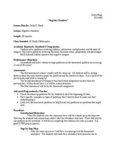 Sixth graders practice using negative numbers by completing number equations. For this math problem solving lesson, 6th graders discuss the different ways negative numbers can be used in a math problem and practice completing...