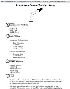 Eighth graders experiment to determine the number of drops of water a heads up penny hold. They create a stem and leaf graph of the class results and use the data for further experimentation on a tails up penny.