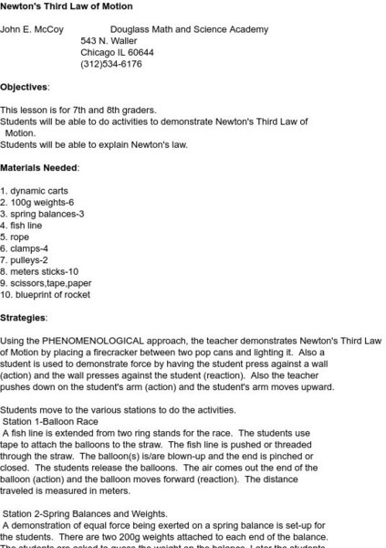 This Illinois Institute of Technology site is a lesson plan and lab that utilizes a toy rocket to investigate Newton's third law. Includes directions and practical applications.