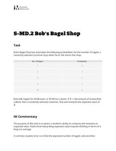 How much money can Bob expect to make per customer by selling bagels? This short expected value problem can be used as a warm up or a quick assessment at the end of a more detailed lesson. Teacher commentary includes the solution to the...