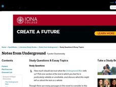 In this online interactive literature worksheet, students respond to 10 short answer and essay questions about Fyodor Dostoevsky's Notes from Underground. Students may check some of their answers online.