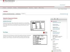 Learners find common ratios of geometric sequences on a spreadsheet. Using this data, they create scatter plots of the sequences to determine how each curve is related to the value of the common ratio. They will consider whether series...
