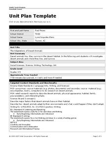 Learners research the adaptations of desert animals and build their research skills. In this the adaptations of desert animals lesson plan, students describe major factors that desert animals have on their habitat. Learners...