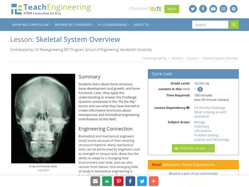 Students will learn about bone structure, bone development and growth, and bone functions. Later, students will apply this understanding to answer the Challenge Question presented in the "Fix the Hip" lesson and use the acquired learning...
