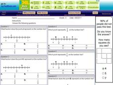 Work with a number line to develop a deeper level of understanding for your young mathematicians. The six multiple-choice questions ask learners to identify where a fraction falls on the number line.