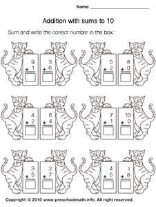 In this addition activity, students solve problems with one digit numbers with sums up to 10. Students complete 12 problems with cats on the page.