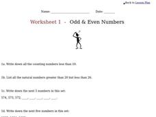 In this math instructional activity, learners examine 6 flower pots which have varying numbers of blooms in a bouquet. The words "odd" and "even" are printed in each flowerpot. Students count the flowers and circle whether the number is...