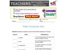 In this water worksheet, students explore the characteristics of water. Kids are given fifteen vocabulary words and definitions which students are to match.
