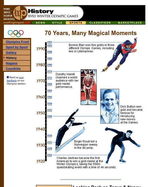 A timeline of each Winter Olympics from 1924 to 1994. Each year is its own link which contains a brief outline and highlights of the games.