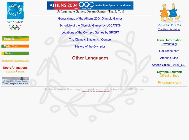 Content includes an interactive map of the games with photographs of individual venues, schedule of events, Olympic history, and guide to Athens.