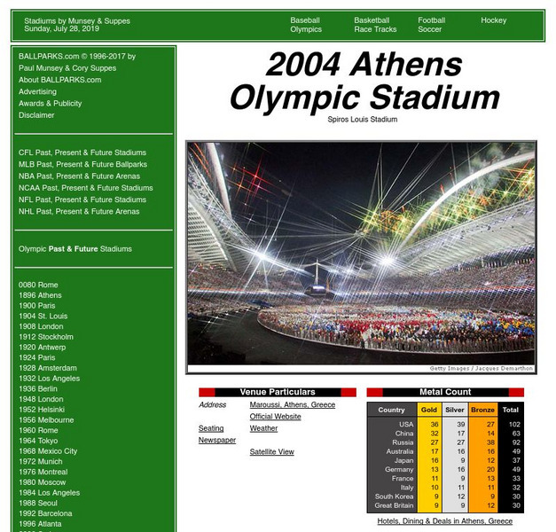 Discover all the information you want to know about the 2004 Athens Olympic Stadium, home of the 2004 Summer Olympics. Includes interesting facts and details about the facility, history of the venue, and Olympic news.