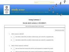 In this online interactive grammar skills learning exercise, students answer 10 multiple choice questions regarding comma use. Students may submit their answers to be scored.