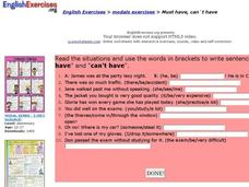 In this must have and can't have worksheet, students read the situations and write sentences using must have or can't have to respond to the situations. Students complete 10 problems.