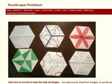 In this geometry activity, students fold paper to make a hexaflexagon. They identify the vertex and all six sides after folding and making their shape. This assignment requires 25 triangles and 19 perfect triangles.