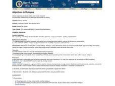 Ninth graders use adjectives to depict setting and reveal character and incorporate adjectives into dialogue appropriate for setting.