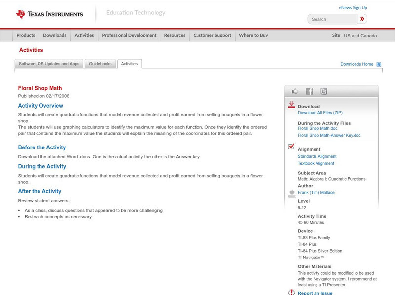 Students will create quadratic functions that model revenue collected and profit earned from selling bouquets in a flower shop. The students can use graphing calculators to identify the maximum value for each function. Once they identify...