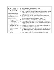 Students investigate the concept of seeds and how they can germinate. They obtain seeds and isolate them in a rubber glove before transplanting them into the ground. The lesson includes a graphic organizer for observations or information.