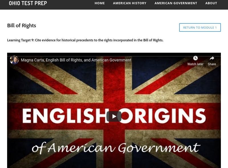 Ohio test preparation material on the Bill of Rights provides three video tutorials that hit specifically learning target 9 which is to cite evidence for historical precedents to the rights incorporated in the Bill of Rights.