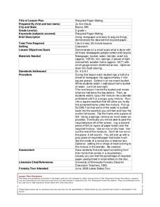 Students experiment with recycling paper. For this paper recycling lesson, students conduct an experiment in which they dissolve newspaper in water and cornstarch to make new pieces of paper. They add color or flowers to the new paper to...