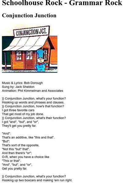 This site from Schoolhouse Rock, although not officially affiliated with the Saturday morning "Schoolhouse Rock" cartoons, reproduces the lyrics to the song "Conjunction Junction." A humorous yet accurate explanation of the rules of...