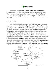 In this amphibian worksheet, students read about the frog life cycle to complete the Venn diagram. They also answer 16 fill in the blank questions about frogs.