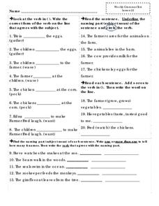 In this weekly grammar worksheet, students answer eight subject verb agreement questions and locate the nouns and verbs in seven sentences. Students also must complete five sentences by writing down the correct verb that agrees with the...