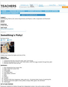Students experience center activities to explore the habits and traits of fish. They observe a goldfish, play a memory game, complete artwork and read about fish.