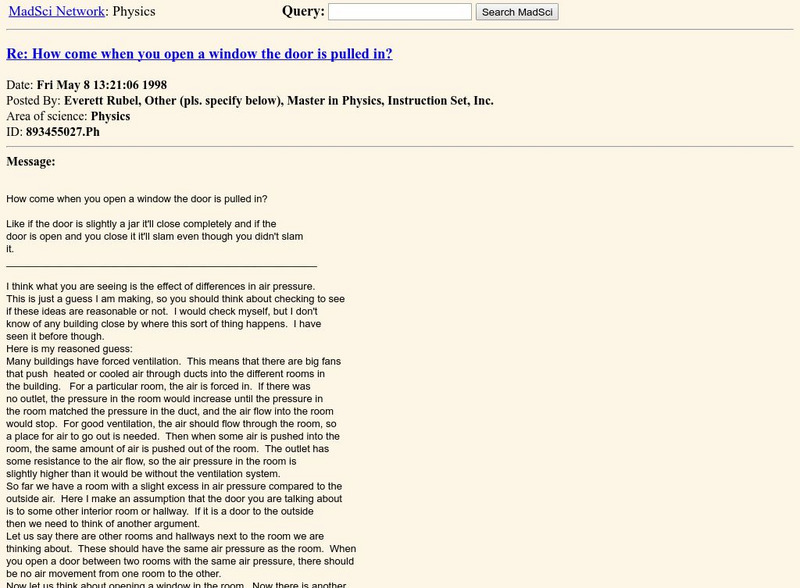 From the Mad Scientist Network. Using a question and answer format, this page explains the answer to the question "How come when you open a window the door is pulled in?" This intriguing everyday phenomenon is explained in terms of air...
