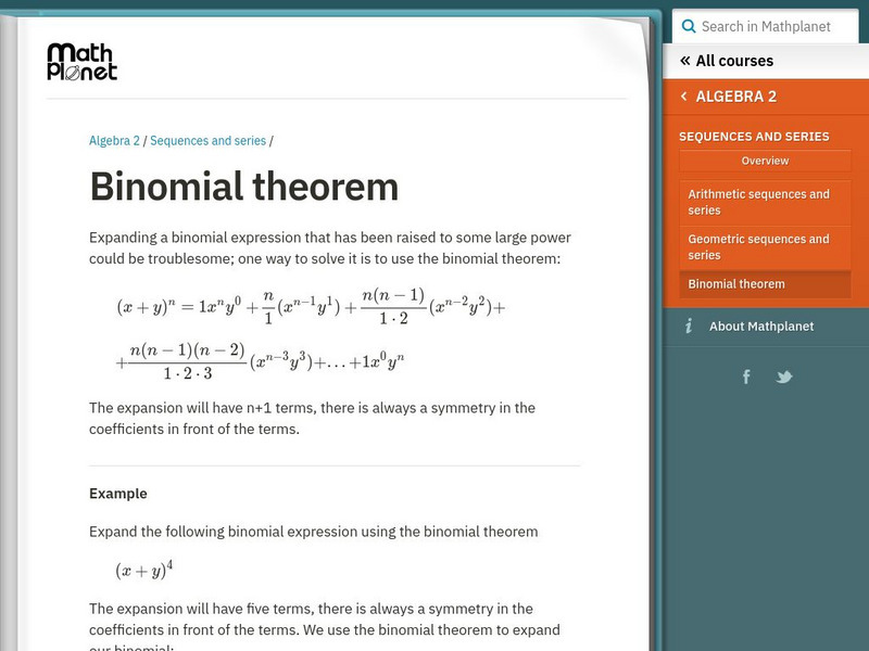 This tutorial contains detailed information about the Binomial Theorem. Includes practice exercises and interactives.