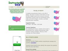 Students practice their reading comprehension skills by reading about the Bill of Rights. They answer questions after reading to test their comprehension.
